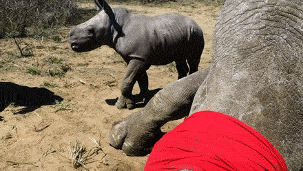 Rinoceronte bebé intenta proteger a su madre de los veterinarios