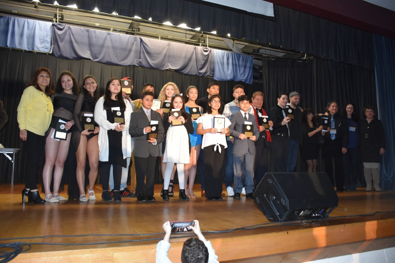 Los 16 artistas que hicieron vibrar el escenario posan con los directivos de por Latin-Americans in Action (LAMIAC), en el auditorio de DOMUS Foundation, de Stamford. (Foto: EL SOL News).