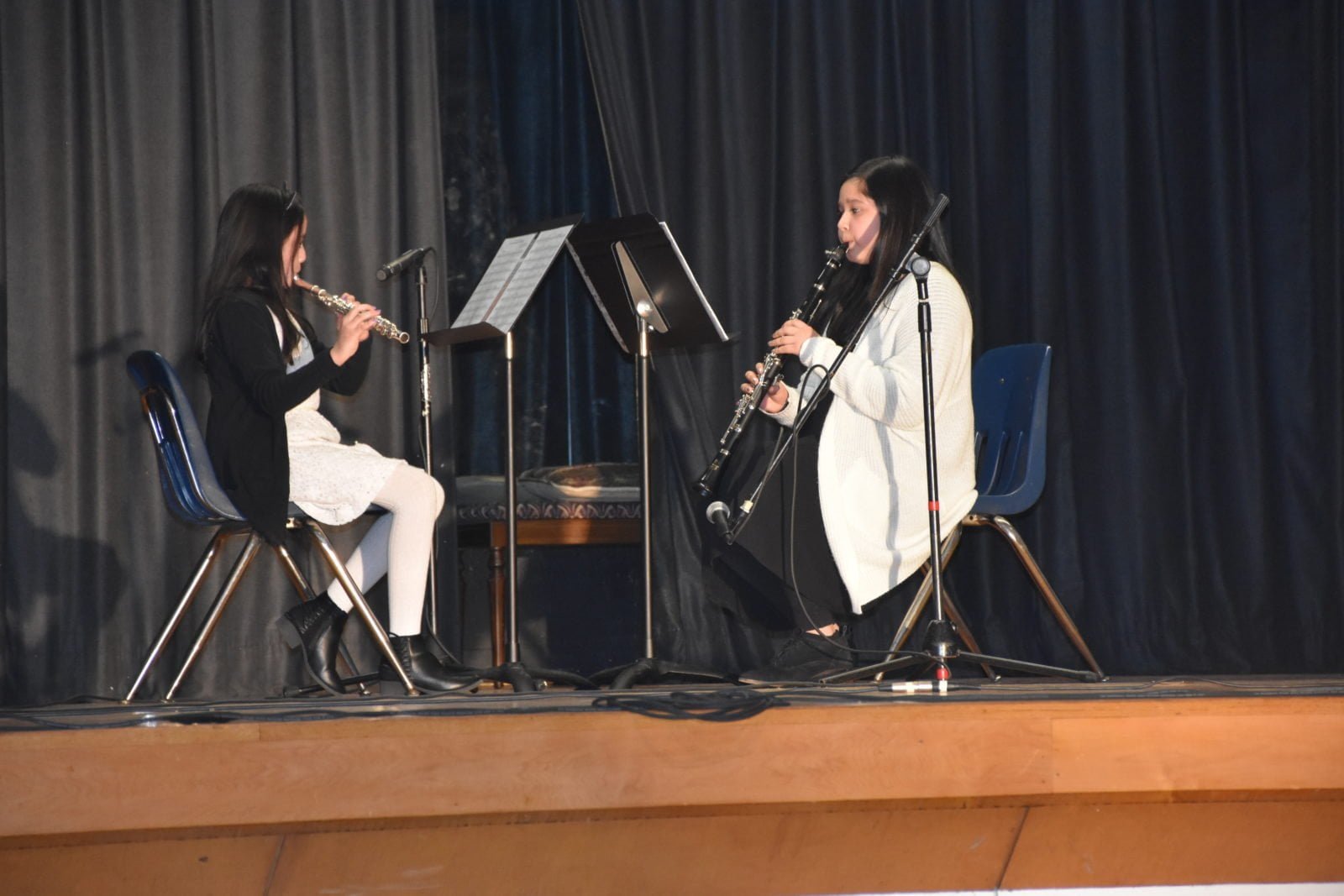 Las niñas Emily Iñiguez (flauta) y Sara Velásquez (clarinete) deleitaron a los presentes con piezas musicales, ejecutadas magistralmente. (Foto: EL SOL News).