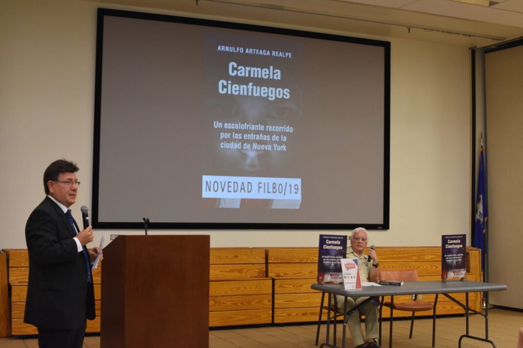 En su exposición, Arteaga Realpe manifestó que “esta novela la considero atípica, ya que quise salir de los moldes literarios tradicionales y proponer un concepto literario diferente. La persona que lea el libro encontrará lenguaje novelado y lenguaje periodístico como una forma de buscar nuevos horizontes a la literatura”. El autor señaló que “Carmela Cienfuegos” es una novela que a través de sus personajes lleva al lector de la mano y como si se tratara de un tour lo hace recorrer las entrañas más vulnerables no sólo de la ciudad de Nueva York sino en general de los Estados Unidos”.