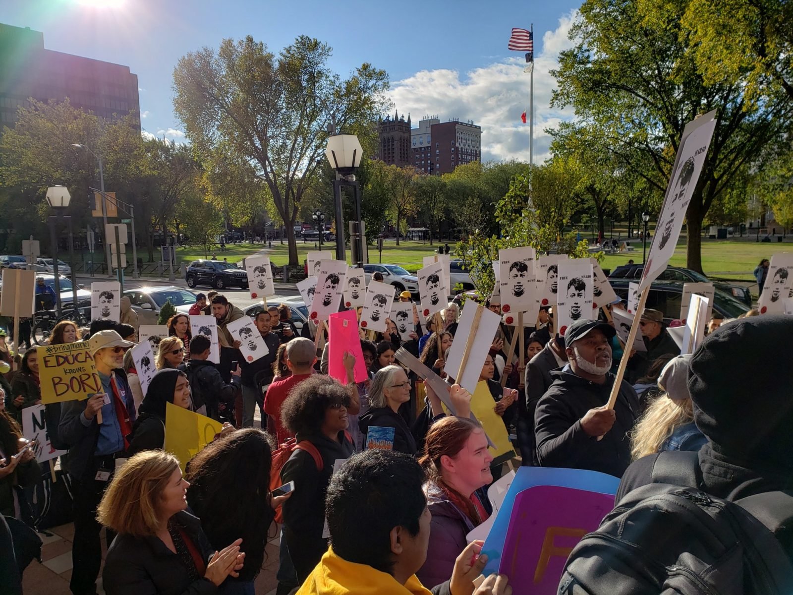 Los cantos resonaron en Church Street cuando una gran multitud se congregó frente al Ayuntamiento de New Haven, el viernes pasado, para pedir la liberación del joven.
