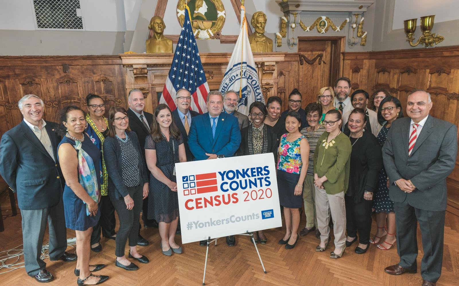 No es sorprendente que la tasa de respuesta en Yonkers sea baja dado que el 31 por ciento de las personas de esta ciudad son nacidas en el extranjero y el 47 por ciento habla un idioma, aparte del inglés en casa. En la foto, el alcalde Mike Spano (centro) junto con miembros del Census Complete Count Committee.