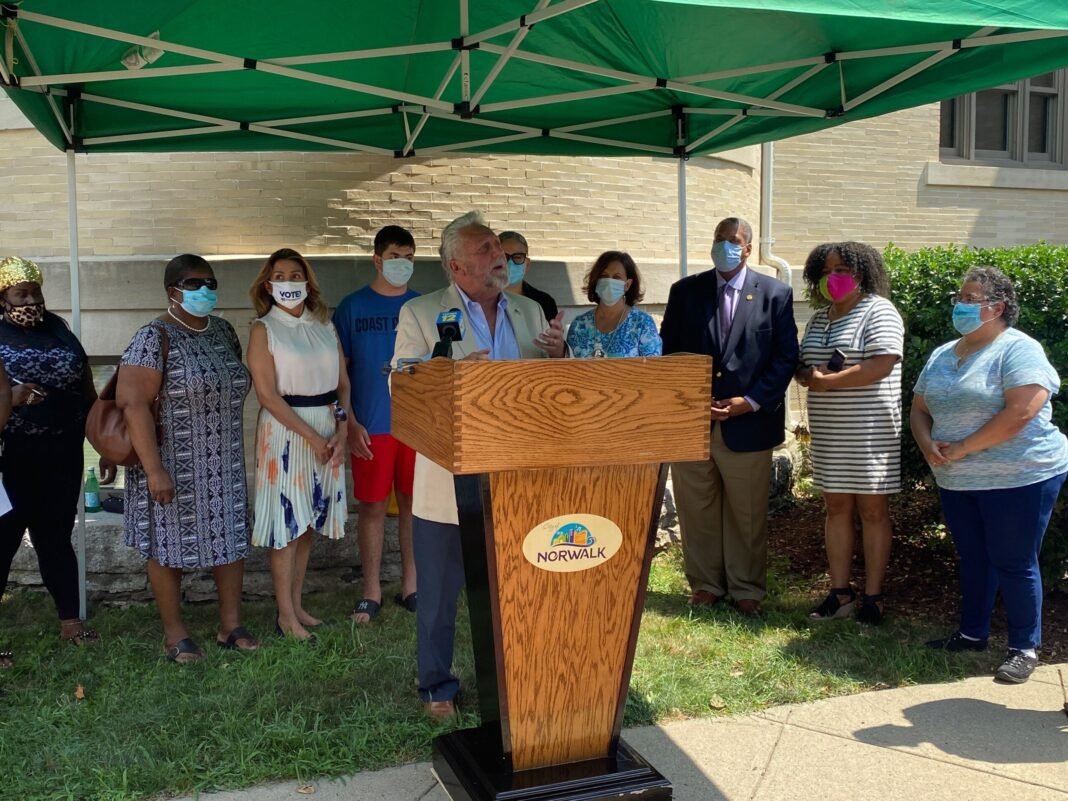 El alcalde Harry Rilling estuvo acompañado por miembros de las escuelas públicas de Norwalk; la superintendente de las escuelas, Alexandra Estrella; miembros de Dalio Education, Altice/Optimum, representantes de la fundación y varias familias para anunciar la iniciativa.