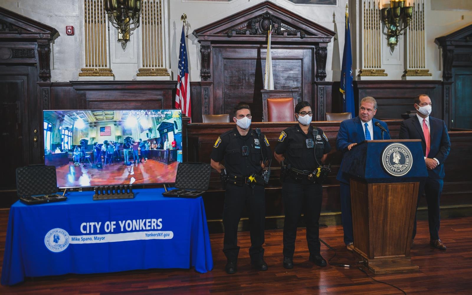 YONKERS.- El alcalde Mike Spano y el comisionado de la policía, John Mueller, anunciaron el lanzamiento del nuevo programa piloto de cámaras corporales del Departamento de Policía.