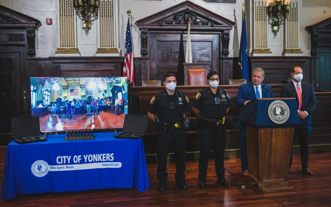 YONKERS.- El alcalde Mike Spano y el comisionado de la policía, John Mueller, anunciaron el lanzamiento del nuevo programa piloto de cámaras corporales del Departamento de Policía.