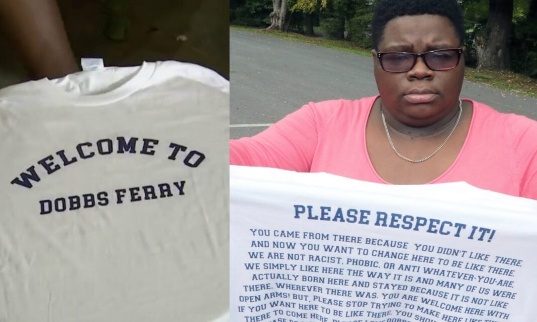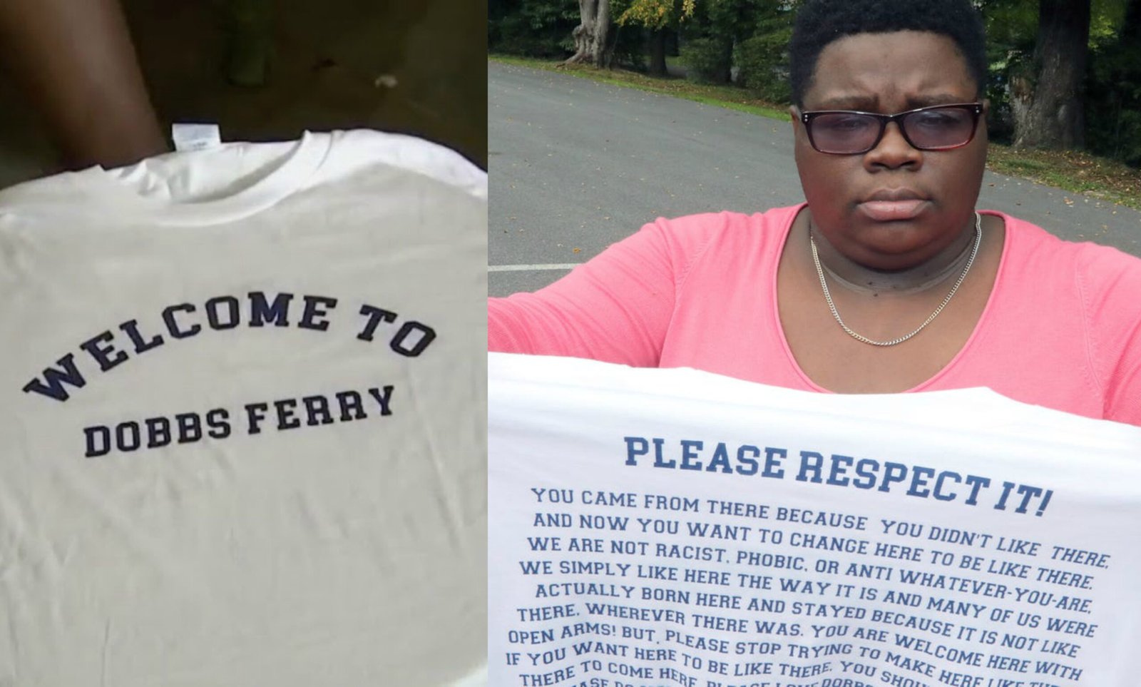 Las aparentemente agradables camisetas de “Bienvenido a Dobbs Ferry” llevan un mensaje más siniestro en la parte posterior, con una frase de “please respect it” (Por favor, respeta esto).