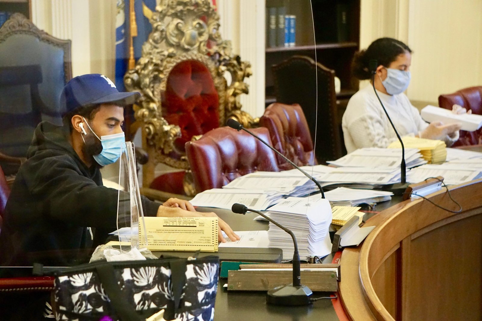 Lamont llevó a cabo la breve ceremonia en el Ayuntamiento de Hartford, donde un equipo de 15 trabajadores temporales se había hecho cargo de las espaciosas salas de la Junta para preparar las boletas de voto en ausencia para enviarlas por correo a los votantes.