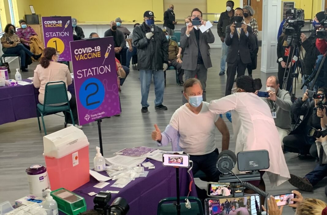 Lamont, que tiene 67 años, recibió su primera inyección de la vacuna Pfizer en una clínica de Trinity Health of New England en la First Cathedral Church, alrededor de las 10:20 de la mañana. durante una reunión con otros funcionarios locales y estatales.