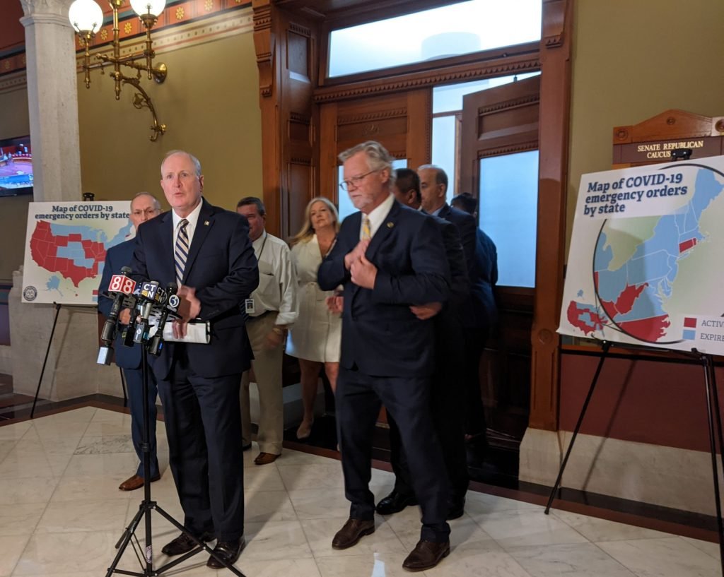 Durante una reunión en las afueras del edificio legislativo, el líder de la minoría Kevin Kelly señaló un mapa de la región noreste. Aunque aproximadamente la mitad de los estados del país todavía tienen órdenes de emergencia, Connecticut y Rhode Island están solos en la esquina noreste.