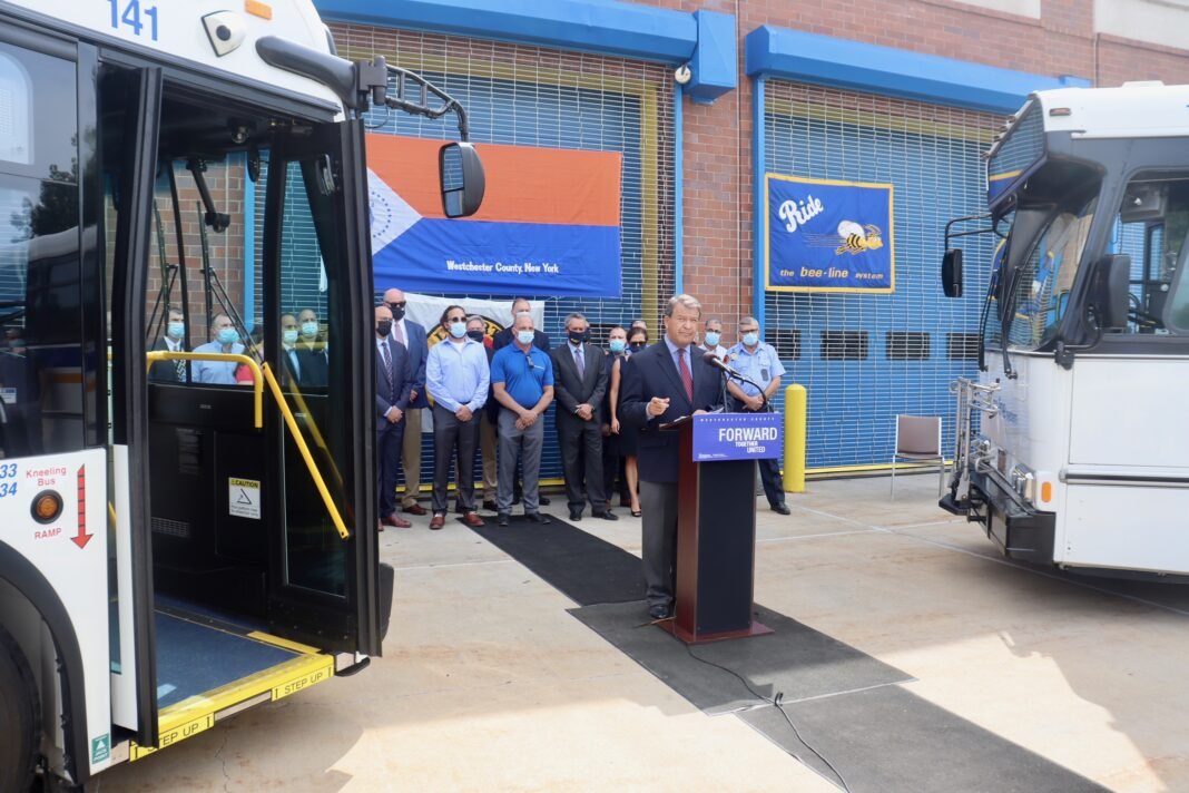 El ejecutivo de Westchester, George Latimer, estuvo presente para dar la bienvenida al primero de los nuevos autobuses, un autobús eléctrico New Flyer Xcelsior XE35.