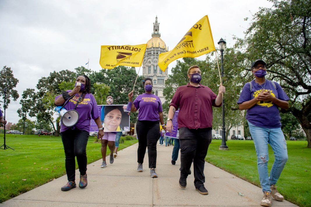 El trío estaba entre varias docenas de trabajadores del New England Health Care Workers Union, SEIU District 1199, que se manifestaron en el Capitolio, el jueves pasado, para que el gobernador Ned Lamont volviera a la mesa de negociaciones para negociar aumentos salariales, atención médica y un camino hacia la jubilación.