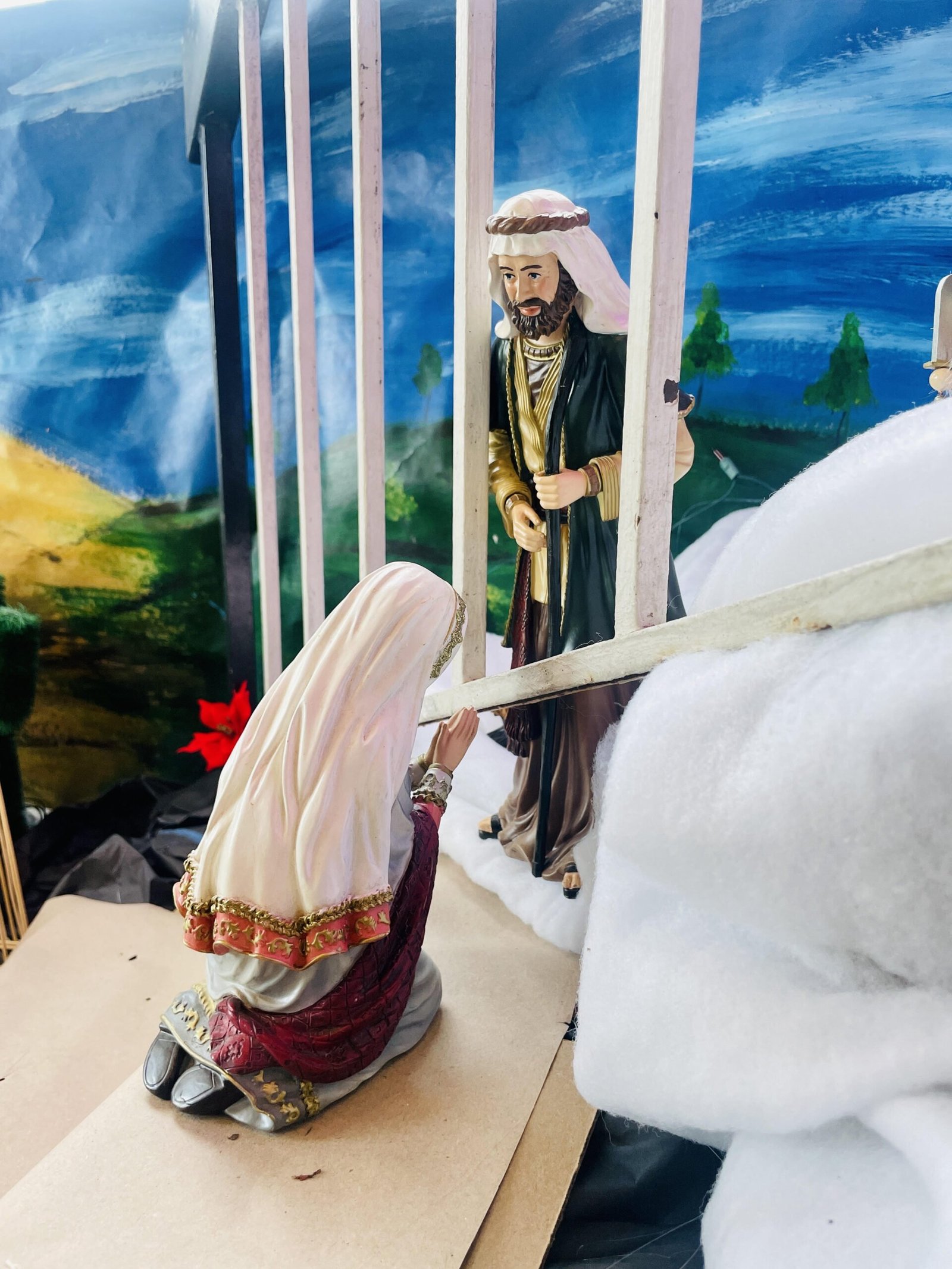 El niño Dios en un pesebre (jaula) acompañado por La Maruca (María) y el Chepe (José) separado por los muros de la frontera