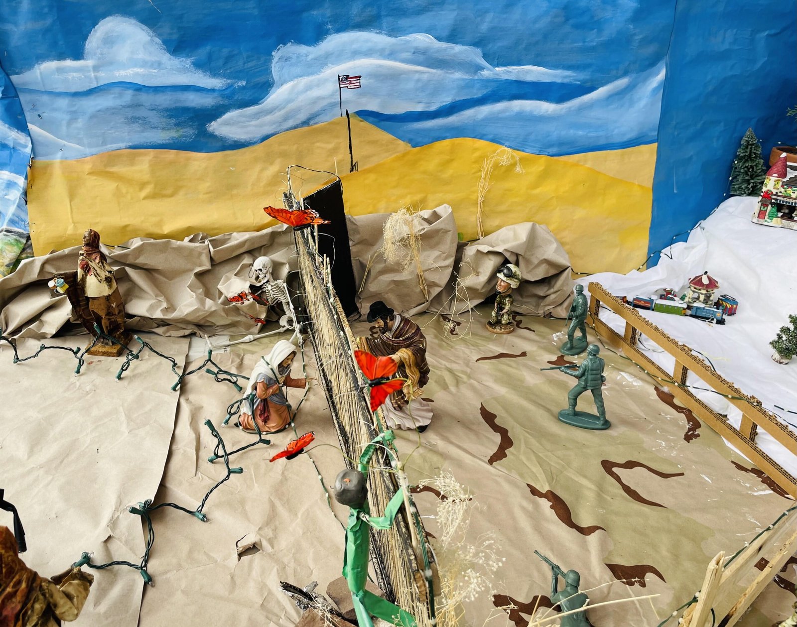 El burro (demócratas y el elefante(republicanos) la blanca navidad impecable, luces, soldados armados listos para disparar, muros, un trencito, muñecos de papel y plasticina, policías, luces navideñas, pegamento, pinceles, pintura, mariposas monarcas, un camioncito volcado lleno de inmigrantes latinoamericanos, piedras papel y tijeras una muñeca barbie y Hasta un dinosaurio puede ser.