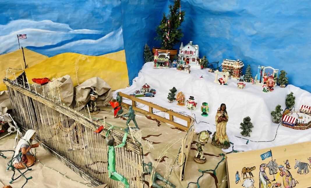 El niño Dios en un pesebre (jaula) acompañado por La Maruca (María) y el Chepe (José) separado por los muros de la frontera