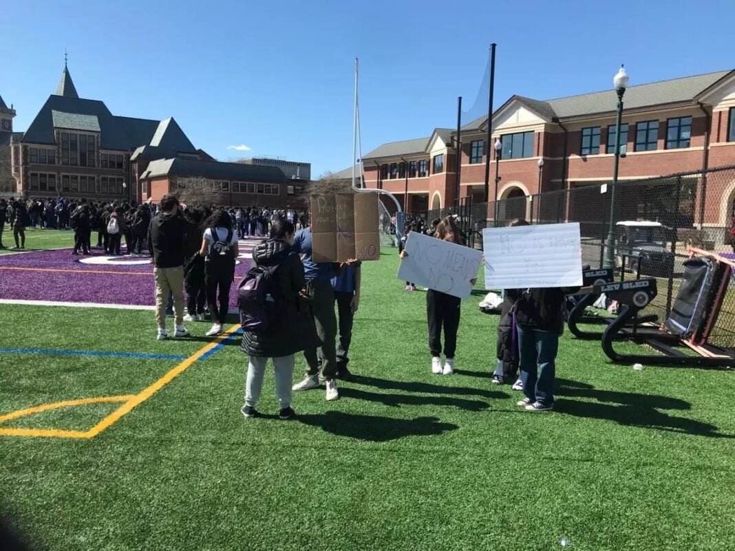 Casi mil estudiantes salieron de la New Rochelle High School al mediodía para reunirse en un campo de práctica fuera de la escuela secundaria.