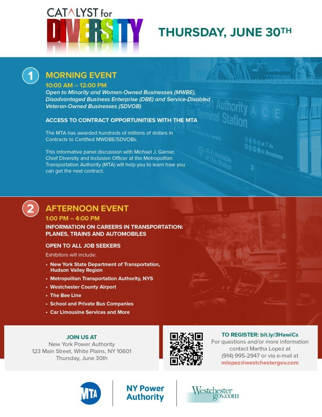 El evento de un día de duración, que se llevará a cabo el jueves 30 de junio, en la New York Power Authority, en 123 Main Street, White Plains, contará con una sesión matutina de 10:00 de la mañana a 12:00 del mediodía, abierta a empresas propiedad de minorías y mujeres (MWBE), y empresas propiedad de veteranos discapacitados en servicio. La sesión de la tarde ofrecerá información sobre carreras en transporte indicó que “el transporte hace que este Condado siga avanzando y permite que los empleados potenciales desarrollen y amplíen las habilidades necesarias para trabajar en nuestro aeropuerto o centros de transporte, incluso en el sector privado. Nos complace asociarnos con la Autoridad Metropolitana de Transporte (MTA) para ofrecer este tipo de oportunidad a las personas que buscan trabajo en Westchester”.