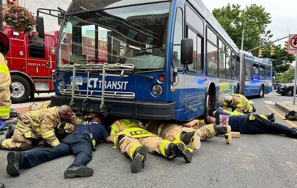 STAMFORD.- Varios bomberos rescataron a una mujer que quedó atrapada debajo de un autobús de CT Transit en Stamford, el martes pasado.