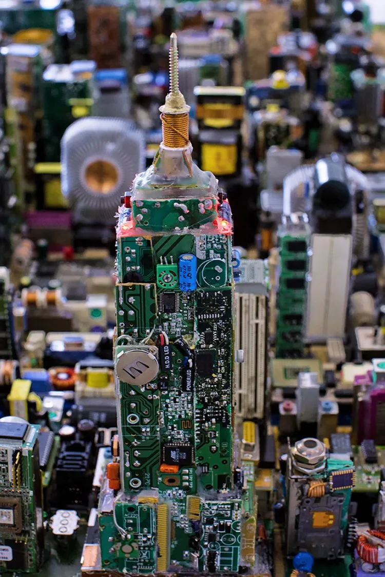 El artista de 17 años, que hizo el modelo para un proyecto escolar, usó 263 cartuchos de pegamento caliente, 27 placas madre, 11 CPU, 10 placas madre de monitor CRT, 18 cartuchos de RAM, 15 baterías, 12 teléfonos Nokia E-series, 7 fuentes de alimentación, 4 relojes, 4 tarjetas de audio, 3 discos duros, 2 teléfonos y varios otros componentes electrónicos para crear versiones matemáticamente correctas de los rascacielos y edificios de Manhattan. Para hacer esto, pasó gran parte de su tiempo recopilando datos en sitios como Google Maps, Wikipedia y Reddit, y luego haciendo cálculos para asegurarse de que todas las miniaturas estuvieran a escala.