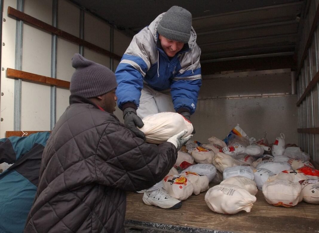 Esta semana Hometown Foundation donó una entrega de varios miles de pavos. Además, en una trastienda clasificando las donaciones hay un par de docenas de voluntarios de Bank of America. La empresa ha patrocinado donaciones de pavos durante 23 años.