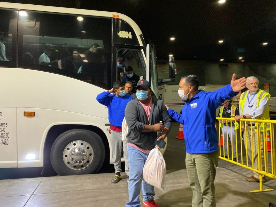 Al caer la noche en El Paso, Texas, fuera del albergue de la parroquia El Sagrado Corazón, en el suroeste de la ciudad, un hombre y una mujer con camisetas y credenciales de la Oficina de Manejo de Emergencias del estado de Texas comenzaron a ofrecer a los inmigrantes un viaje gratis en bus a Nueva York o Chicago, según pudo comprobar EFE.