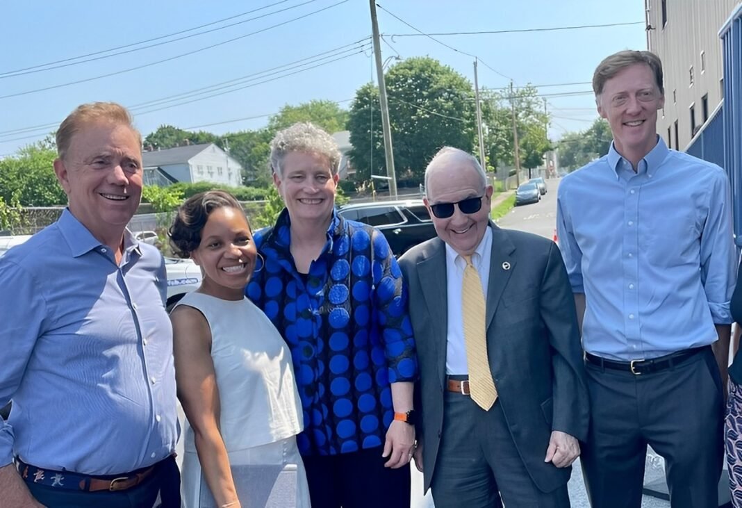 El gobernador Ned Lamont, la comisionada estatal de la Oficina de la Primera Infancia, Beth Bye, el alcalde Justin Elicker y una media docena de legisladores estatales, funcionarios municipales y proveedores de cuidado infantil y simpatizantes se reunieron afuera del almacén de LULAC Head Start, que fue convertido en espacio para salones de clase en 106 Haven Street, para anunciar 2 millones de dólares en bonos estatales que ahora se dirigen al programa local de cuidado de niños.