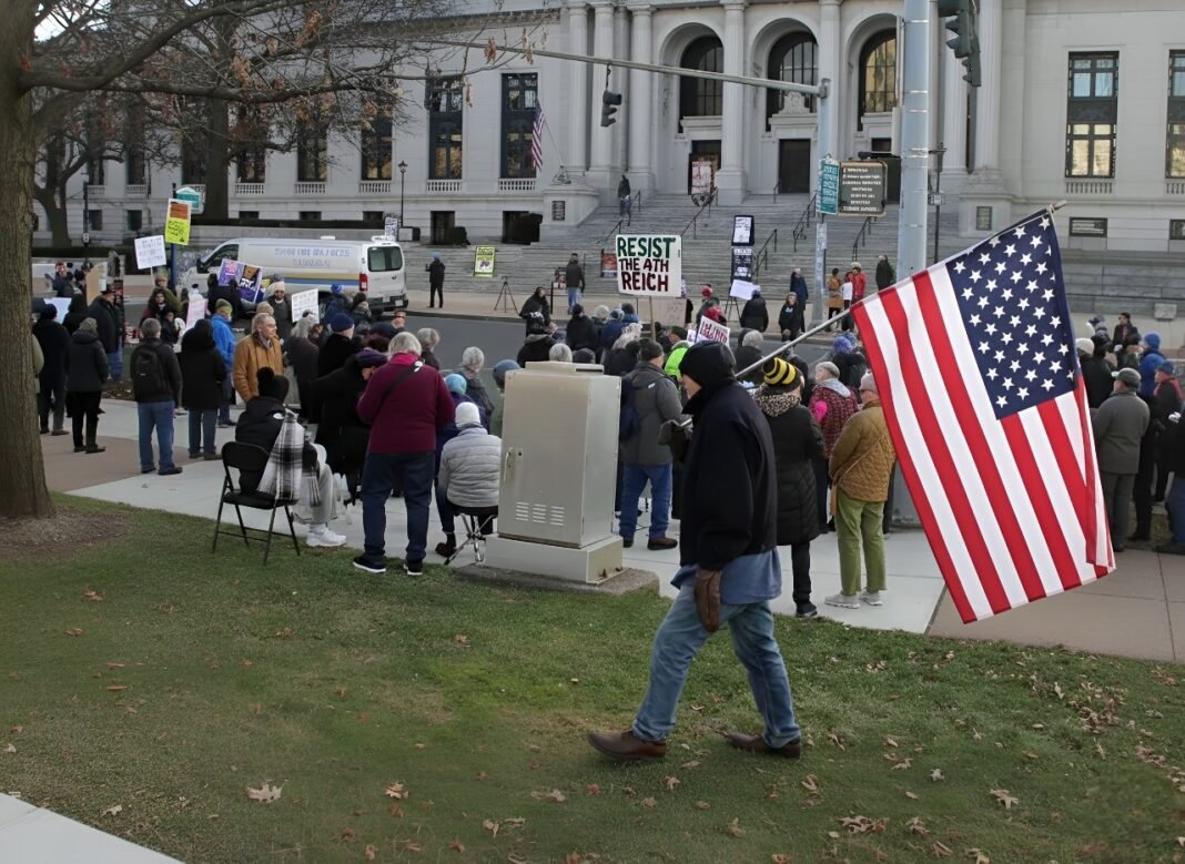 En Hartford, el punto principal de reunión fue frente al Capitolio estatal, donde los organizadores buscan reunir a manifestantes para hacer visibles sus demandas contra lo que describen como un ascenso de medidas autoritarias bajo la administración federal.