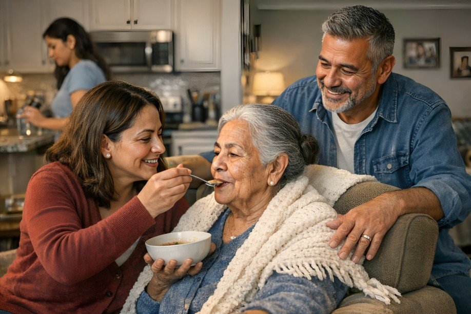 Estudios recientes muestran que los adultos mayores latinos tienen más probabilidades de vivir con hijos u otros familiares en lugar de hacerlo solos. Esto significa que el envejecimiento “en casa” suele ocurrir dentro de una red familiar amplia, donde el cuidado recae principalmente en los propios parientes.