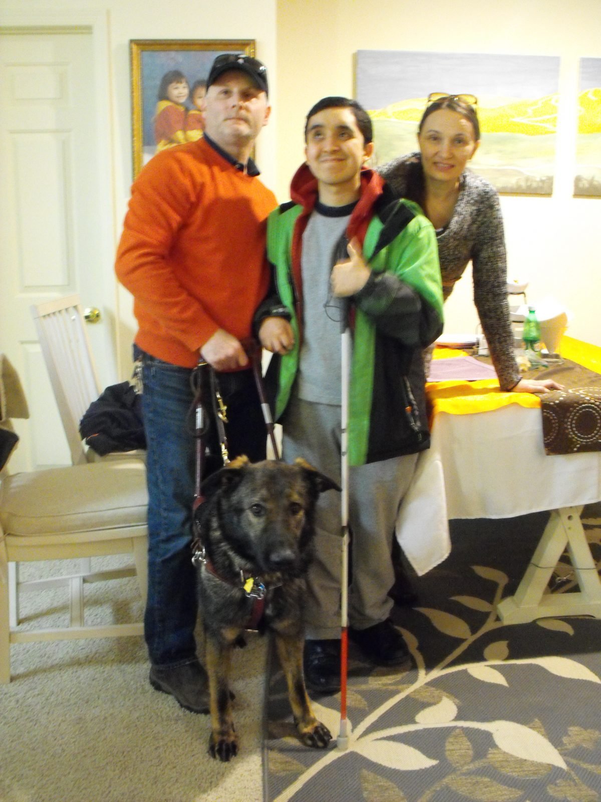 Phillip Magalnick, Renzo Ríos-Niño y Honorata Kazmierczak junto a la perra guía pastor alemán “Cloe”. (Texto y fotos: Guadalupe Ramos/EL SOL News).